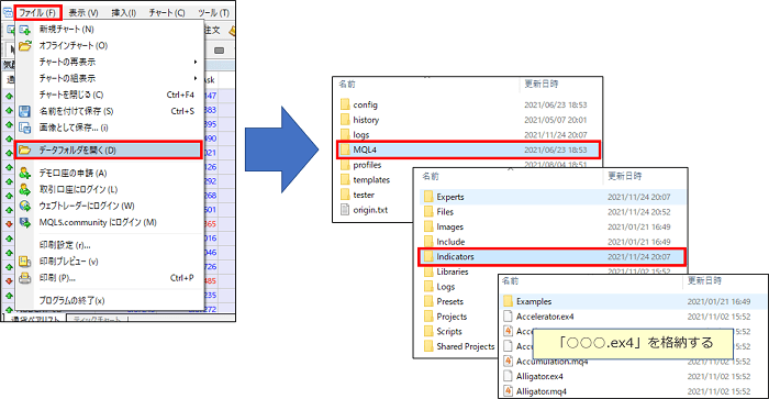 FXTF MT4 PCインストール版を起動して「ファイル」>「データフォルダを開く」>「MQL4」>「Indicators」フォルダに、1.で保存した「○○○.ex4」ファイルをコピー&ペーストして格納します。