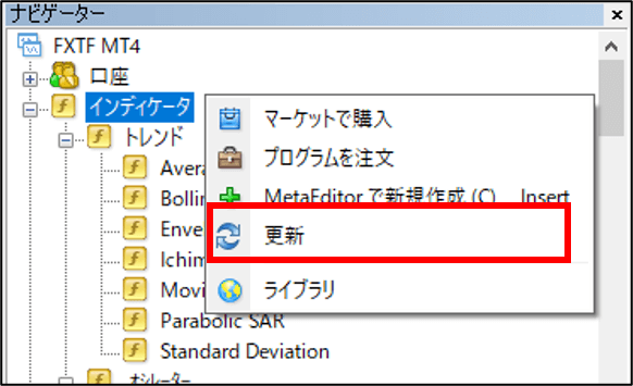 「ナビゲーター」ウィンドウ内で右クリックして「更新」を選択すると「ナビゲーター」ウィンドウに追加したインディケータ名が表示されます。