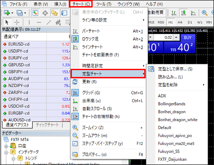 複数のインディケータやチャートの色等の情報をまとめて保存したものが定型チャートです。チャートの色やインディケータ等全てのチャート情報が適用した定型チャートの情報で上書きされます。 |