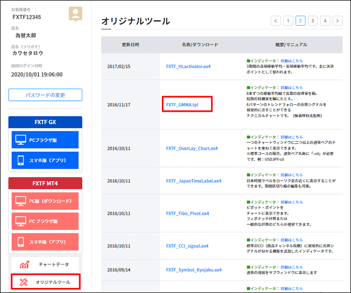 マイページにログインして、サイドバーの「オリジナルツール」ボタンをクリックすると、オリジナルツール一覧が表示されます。