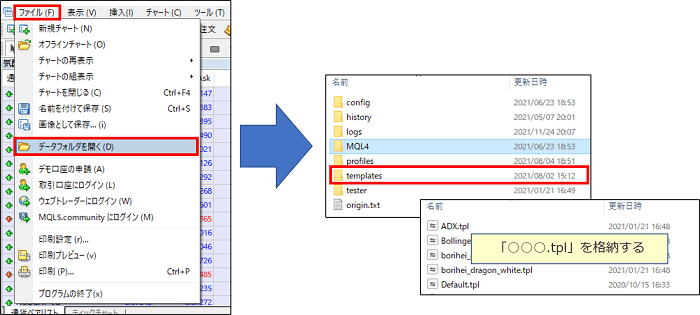 FXTF MT4 PCインストール版を起動して「ファイル」>「データフォルダを開く」>「templates」フォルダに、1.で保存した「○○○.tpl」ファイルをコピー&ペーストして格納すると定型チャートに反映されます。