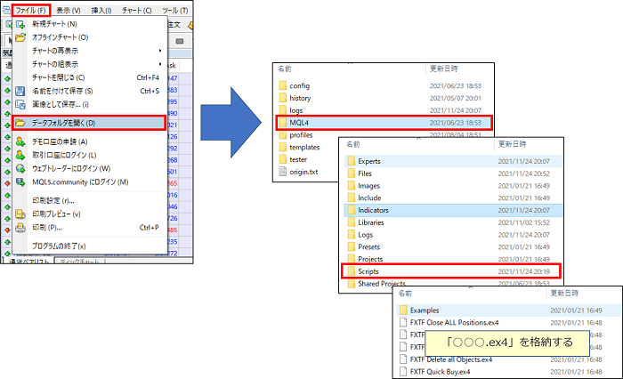 FXTF MT4 PCインストール版を起動して「ファイル」>「データフォルダを開く」>「MQL4」>「Scripts」フォルダに、1.で保存した「○○○.ex4」ファイルをコピー&ペーストして格納します。